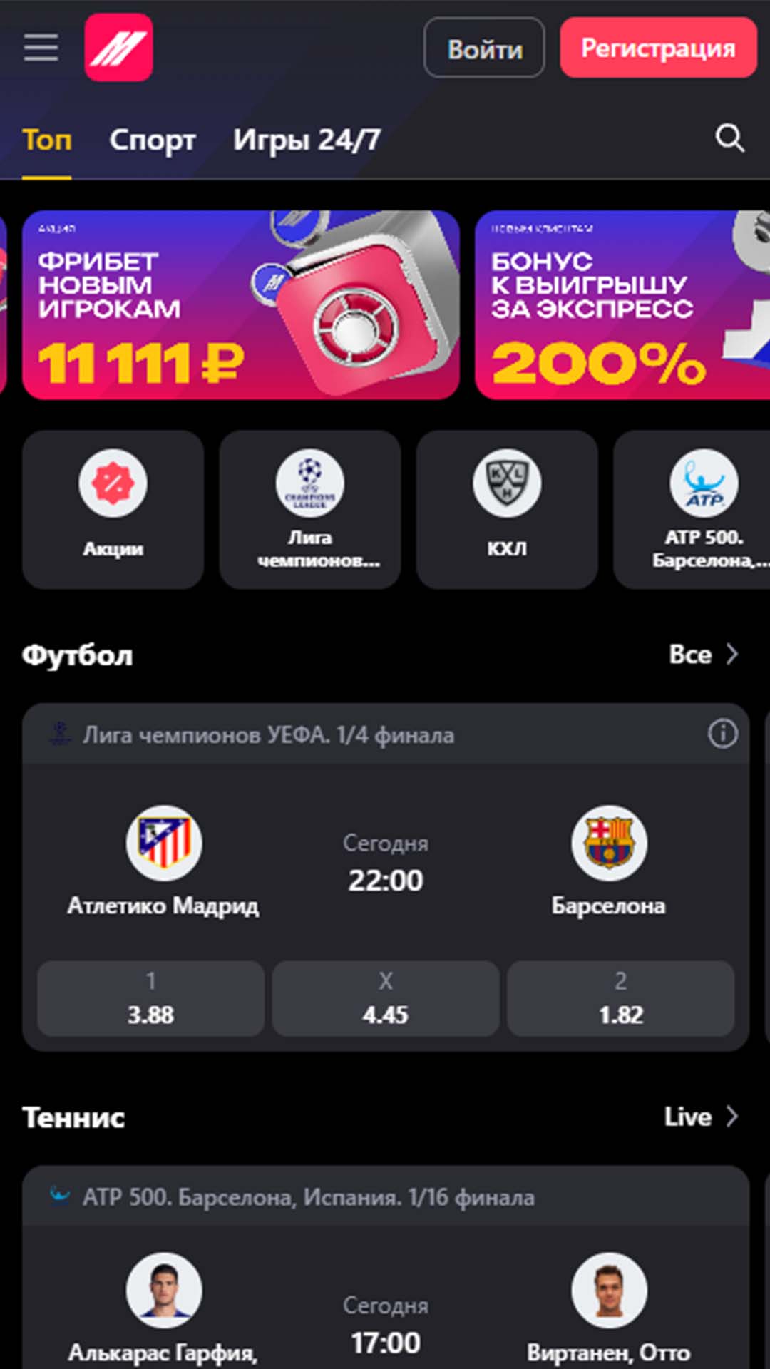Изменение дизайна Марафона можно увидеть уже на главной странице. На ней появился раздел «Топ» — персонализированная лента с актуальными акциями и спортивными событиями, подобранными именно под ваши предпочтения. Больше не нужно искать интересные матчи по всему сайту: всё самое важное собрано в одном месте.