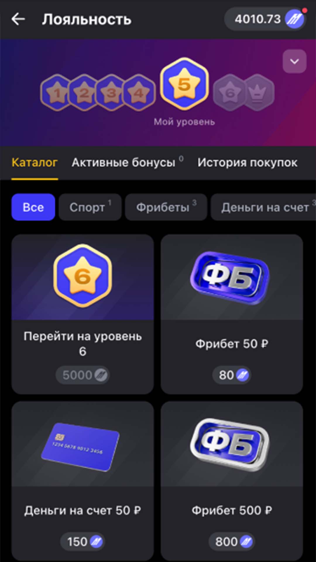 В рамках редизайна Марафон также обновил отображение программы лояльности. Это система поощрения, которая позволяет накапливать очки за квалифицирующие ставки на спорт и обменивать их на награды из каталога бонусов. Особое внимание мы уделили шкале прогресса, чтобы вам было еще удобнее отслеживать заработанные баллы и доступные предложения.